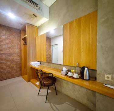 Dilengkapi dengan lemari dan meja yang besar dan fungsional, dirancang untuk menyimpan berbagai barang keperluan bagi tamu.