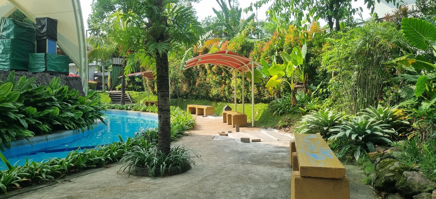Gazebo di sekitar kolam, istirahat tanpa khawatir kehilangan pengawasan